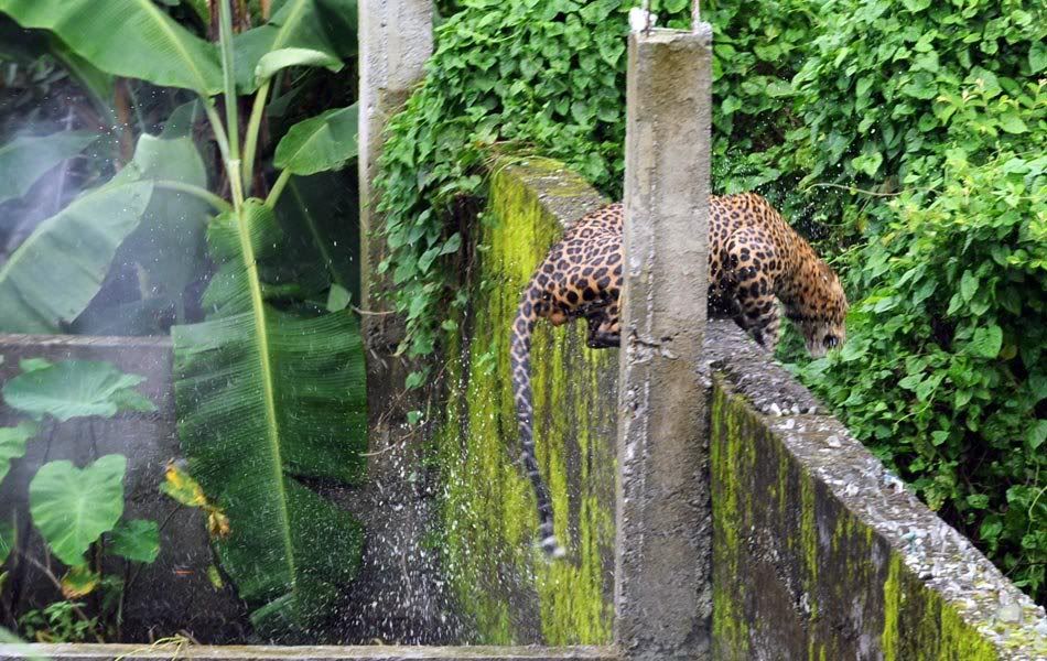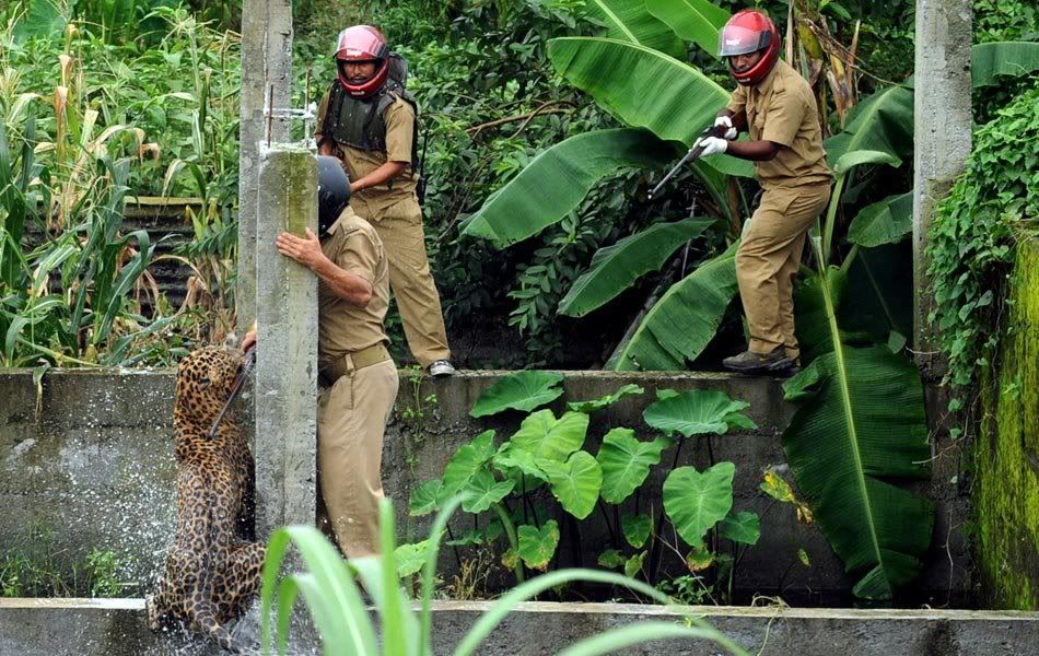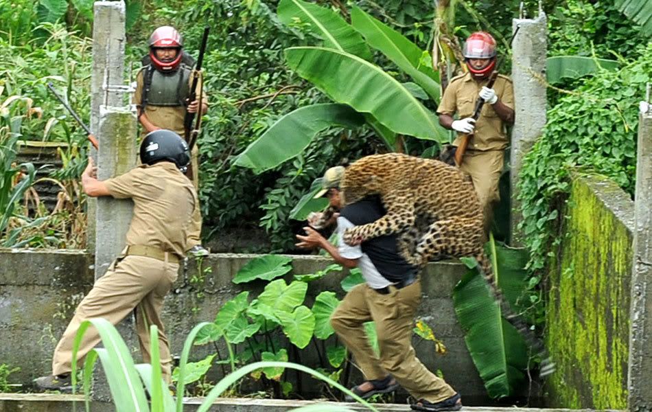 A leopard was shot dead after it attacked and injured six people in a slum in West Bengal's Darjeeling district Tuesday. In Photo: A leopard (Panthera pardus) pounces on a forest guard at Prakash Nagar village near Salugara on the outskirts of Siliguri