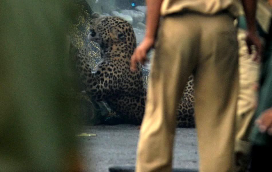 The leopard (Panthera pardus) attempts to escape after attacking Indian forest guards at Prakash Nagar village near Salugara on the outskirts of Siliguri.