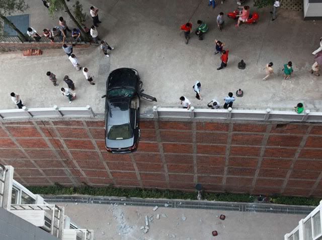 A couple had a very lucky escape after nearly reversing their car off a 15m drop in Changsha, capital of southern China's Hunan Province. The man and woman were parked on the top of a car park when the incident happened.