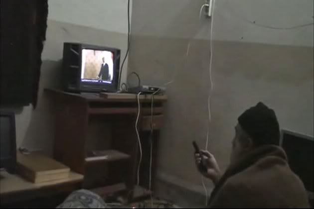 In this undated image from video seized from the walled compound of al-Qaida leader Osama bin Laden in Abbottabad, Pakistan, and released Saturday, May 7, 2011 by the U.S. Department of Defense a man, who the American government identified as Osama bin Laden, watches television, showing an image of U.S.