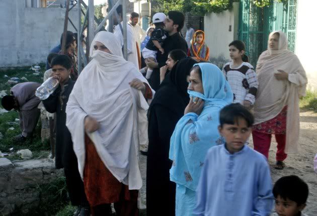 Local residents gather to view the house of former al-Qaida leader Osama bin Laden, seen in background, in Abbottabad, Pakistan, on Sunday, May 8, 2011, as security stops people approaching close to the walled compound.